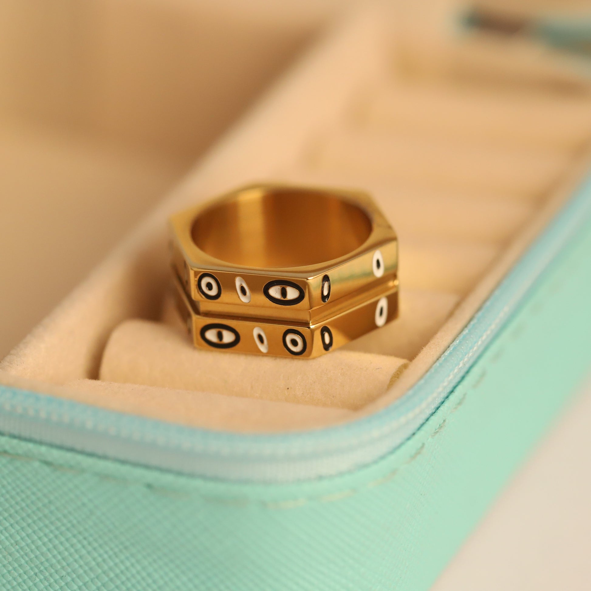 Crafted from durable stainless steel and lavishly plated in 22K gold, this ring is designed for both enduring beauty and everyday practicality. It's built to be waterproof and tarnish-resistant, ensuring its radiant shine lasts through daily wear without worry. Perfect for adding a touch of contemporary edge and meaningful charm, this hexagonal evil eye ring is an ideal accessory for those who dare to be different.