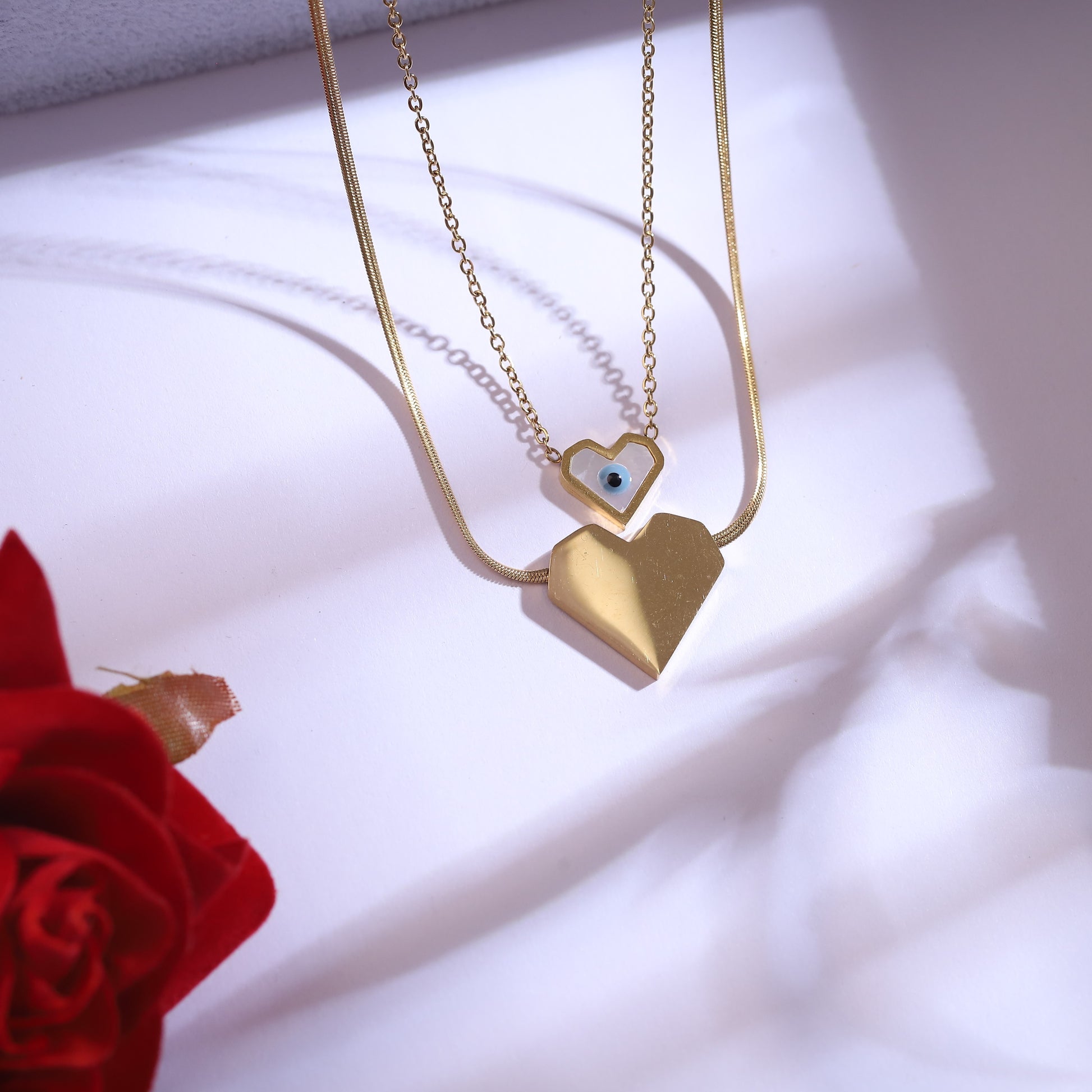 22K Gold Plated Layered Heart Evil Eye Necklace Set | Stainless Steel Protection Jewelry