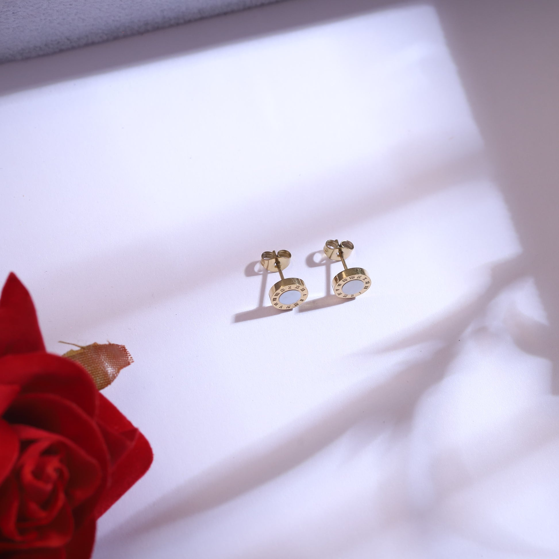 Embrace timeless sophistication with this captivating three-layered necklace and earring set! This exquisite ensemble features a harmonious blend of styles for a perfectly curated look. The top layer is a sleek chain adorned with delicate open circle charms, while the middle layer adds visual interest with its snake chain texture. The longest layer showcases a prominent round pendant, beautifully designed with classic Roman numerals encircling a pristine white (likely Mother of Pearl or enamel) inlay, reminiscent of an ancient coin or a classic timepiece. The set is completed with matching stud earrings, each featuring the elegant Roman numeral and white inlay motif, ensuring a cohesive and refined style.