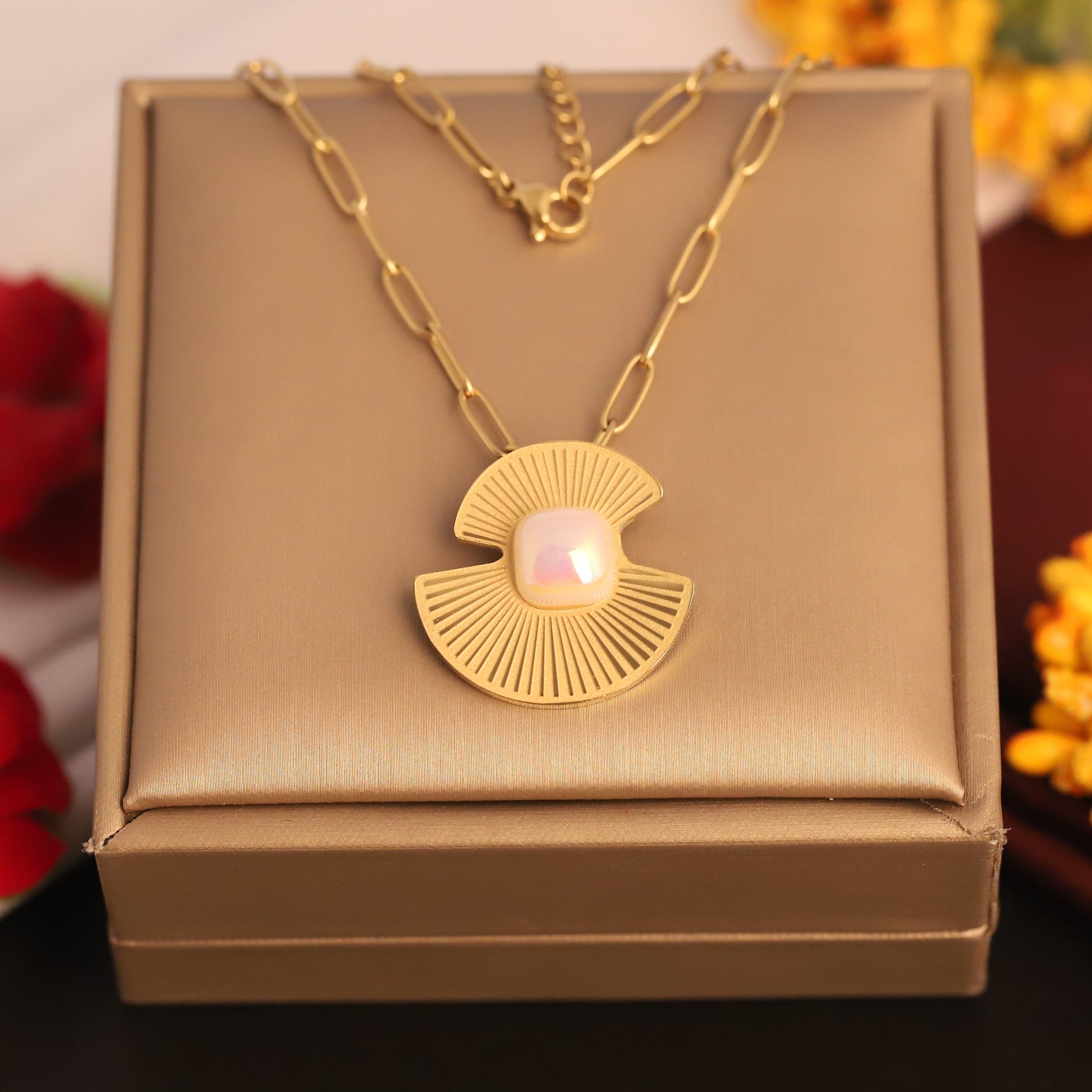 Step back into a time of glamour with our art deco-inspired mother-of-pearl necklace. This unique and eye-catching piece features a modern gold-toned paperclip chain that provides a bold and contemporary foundation. The centerpiece is a stunning pendant with a geometric, fan-like design.