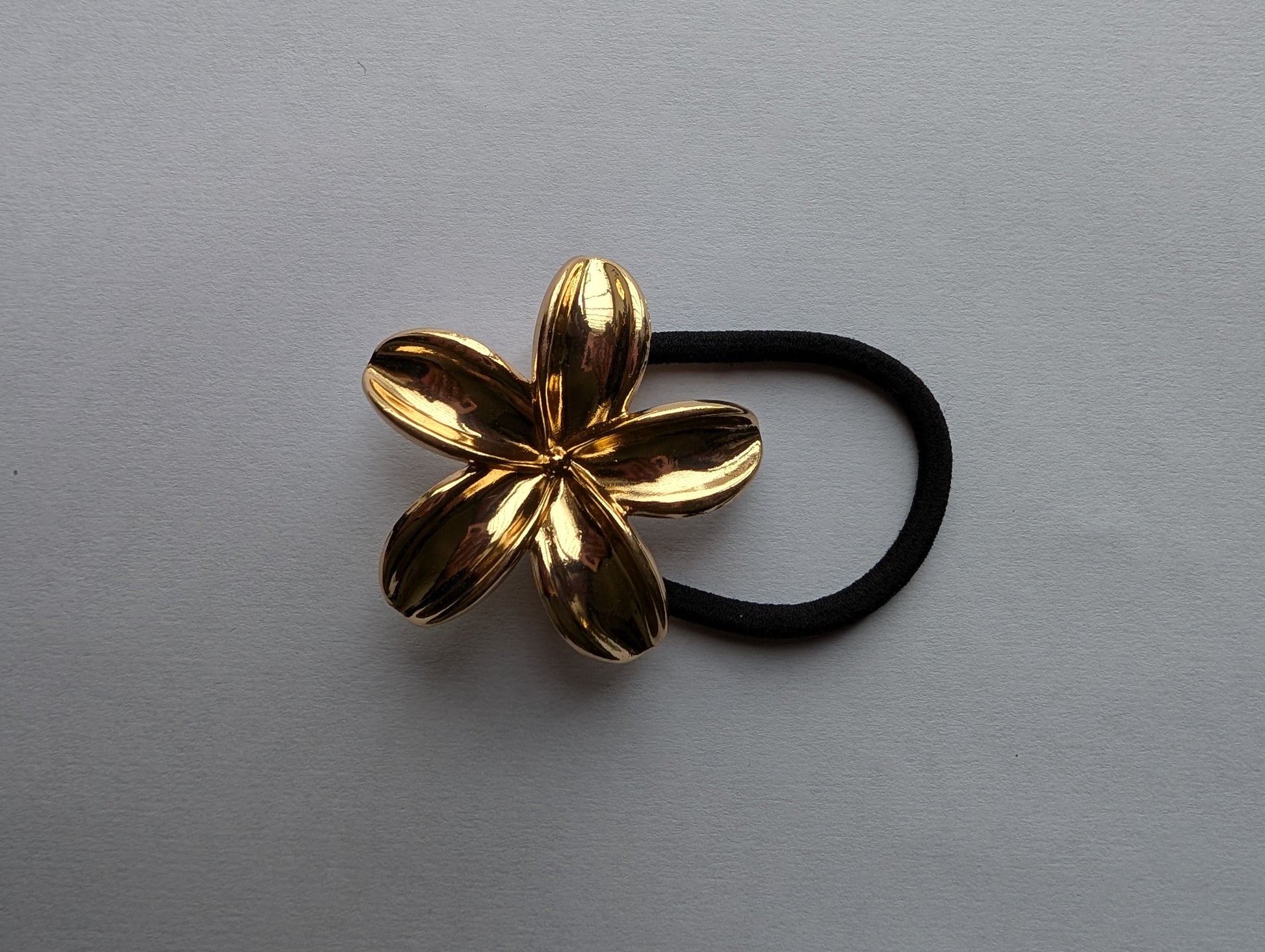 The centerpiece of this hair tie is a lustrous, polished gold-toned flower, meticulously designed with five graceful petals that radiate a timeless charm. Attached to a strong, yet gentle black elastic band, it provides a secure and comfortable hold for all hair types without pulling or snagging.
