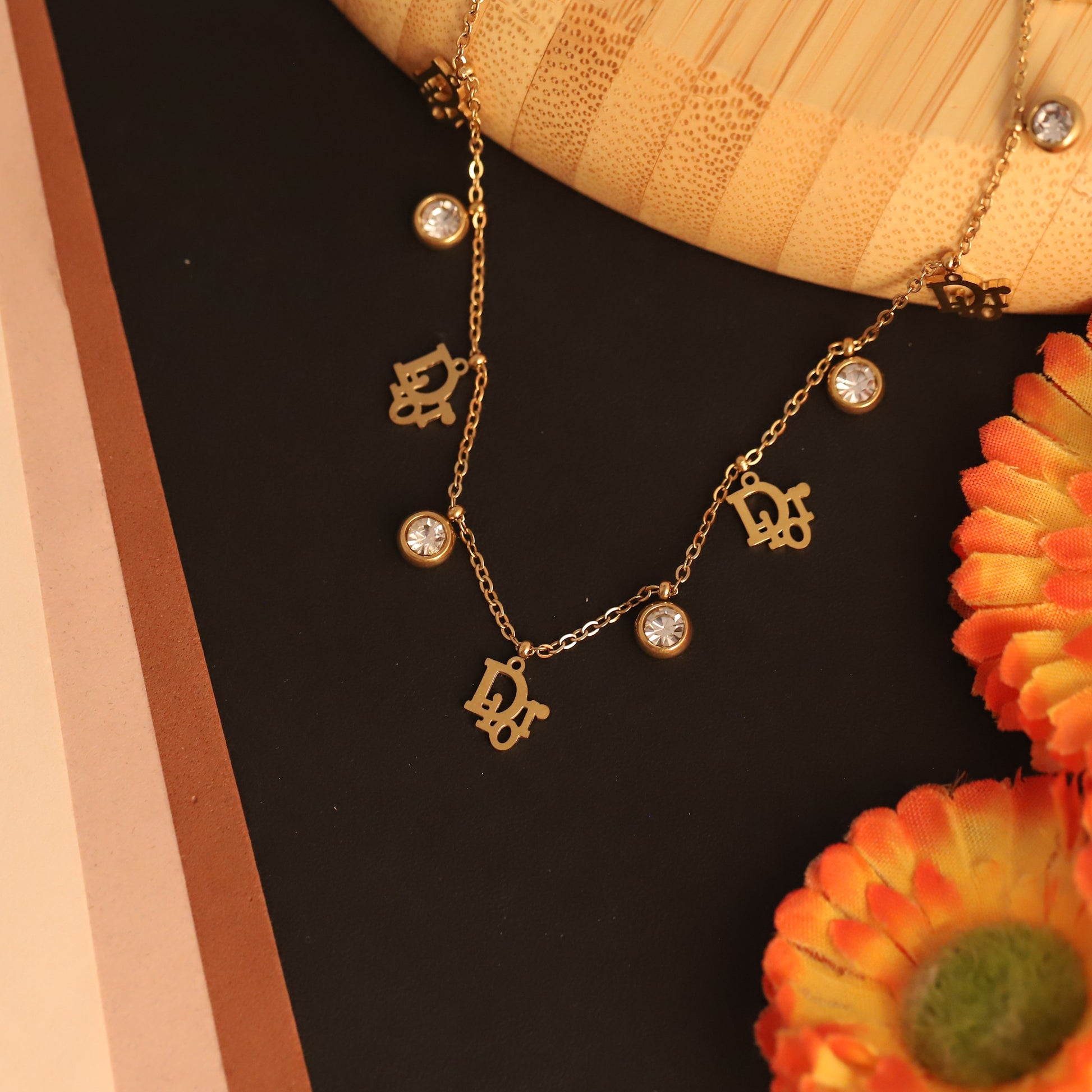 Crafted with high-quality gold plating, this necklace offers a brilliant shine and a durable finish, perfect for everyday wear or special events. The shimmering zircons beautifully catch the light, adding a subtle yet striking sparkle, while the distinctive 'D' charms provide a unique and fashionable flair.