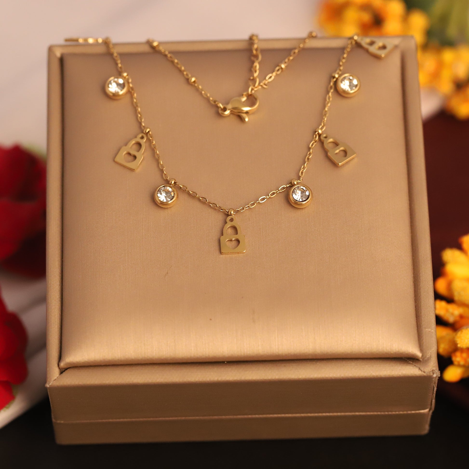 Crafted with high-quality gold plating, this necklace offers a radiant shine and a durable finish, perfect for everyday wear or special events. The shimmering zircons beautifully catch the light, adding a subtle yet striking sparkle, while the unique lock charms add a symbolic and fashionable touch.