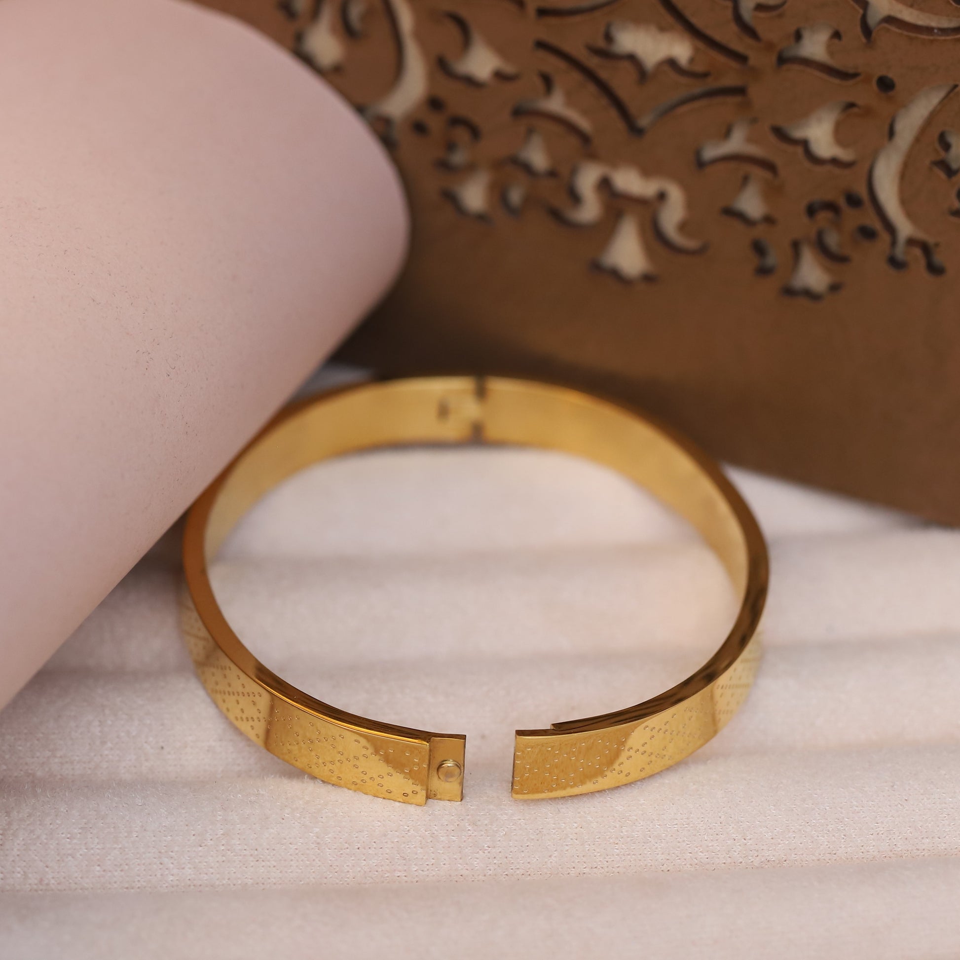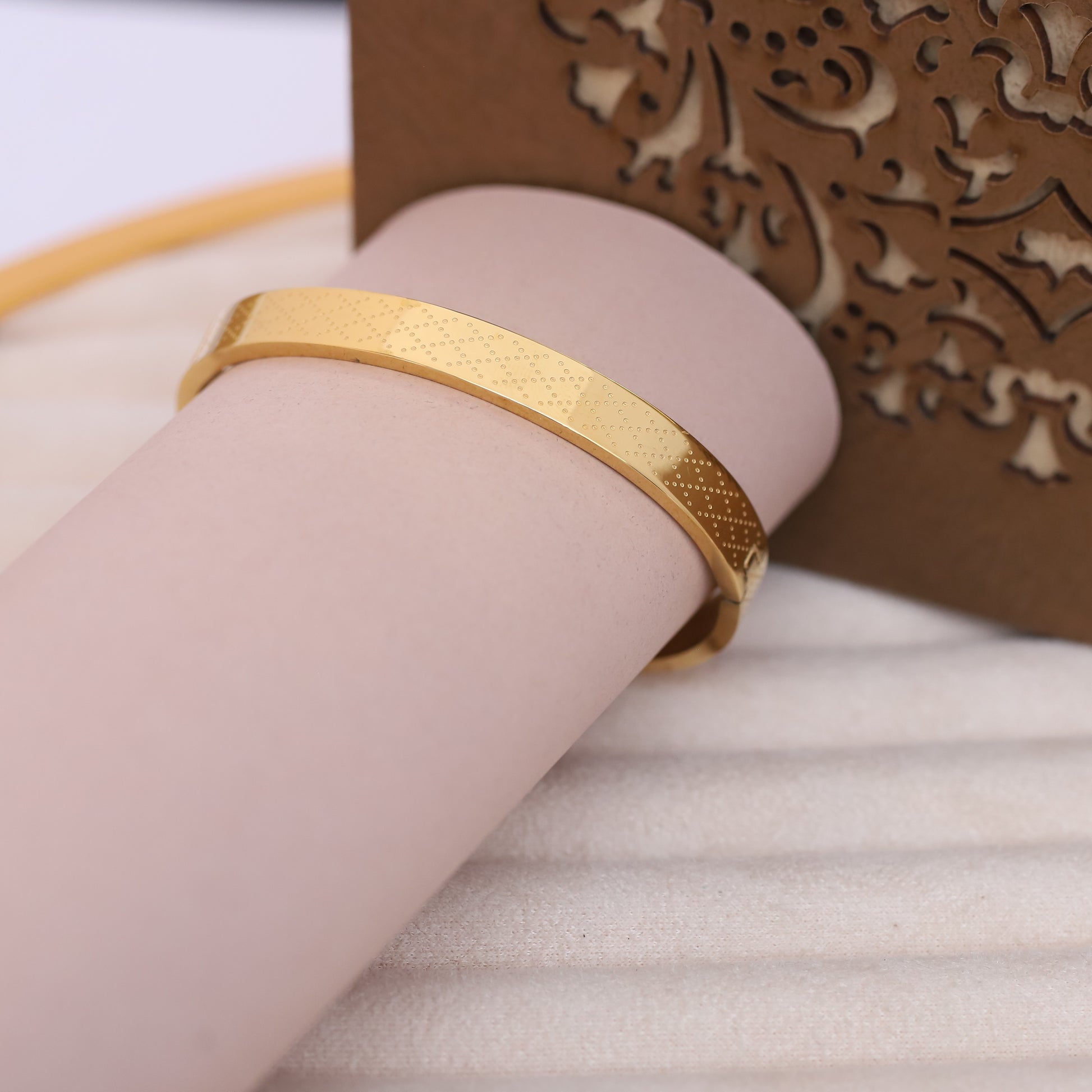 Design: Solid, round bangle with a flat top and dotted texture