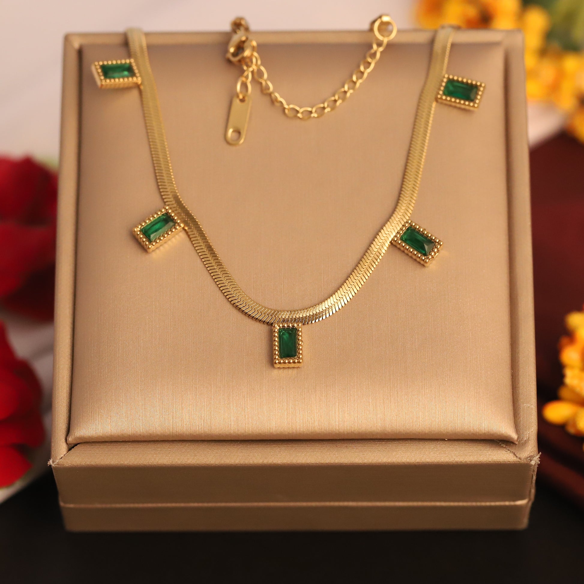 Add a subtle touch of color and elegance to your neckline with our refined emerald accent gold snake chain necklace. This delicate piece features a smooth and flexible gold-toned snake chain adorned with five small, rectangular emerald-green crystals.