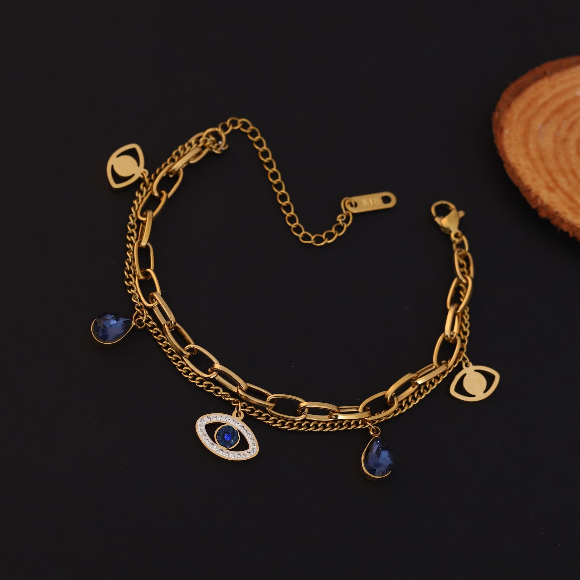 Embrace good vibes with our stunning Evil Eye Chain Bracelet, a global favorite for its powerful positive energy. This popular piece features a 22K gold-plated, two-layer chain adorned with protective evil eye charms. Crafted from durable stainless steel, it's also completely waterproof, making it perfect for everyday wear.