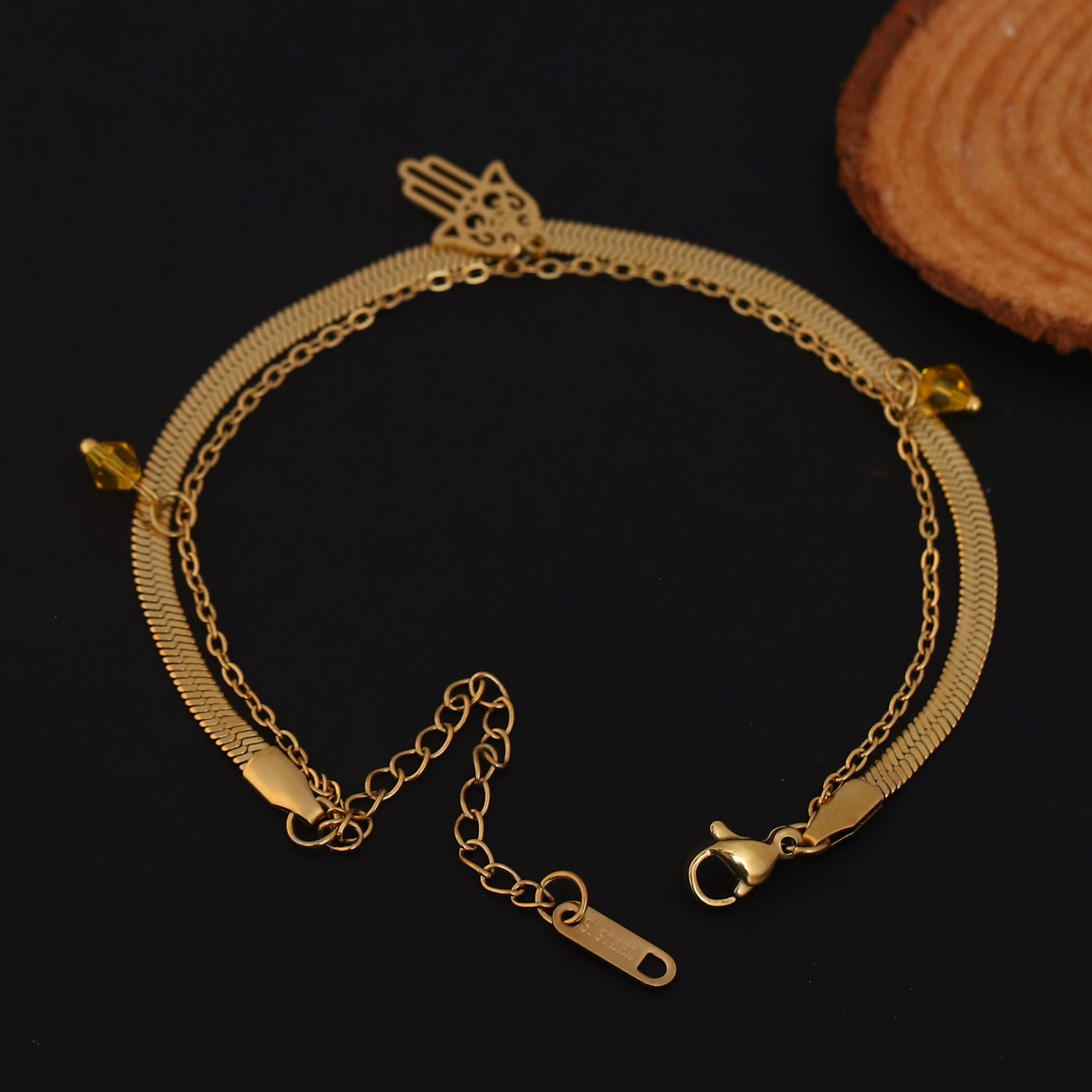 Embrace protection and positive energy with this stunning gold-tone layered bracelet. This piece features a chic dual-chain design: a sleek herringbone chain forms the base, beautifully complemented by a delicate cable chain. The centerpiece is a intricately detailed Hamsa hand charm, an ancient symbol of protection, good fortune, and strength. Adding a subtle touch of color and sparkle are two vibrant amber-yellow bead accents, perfectly enhancing the golden hues. Crafted from durable stainless steel, this bracelet offers both lasting quality and meaningful symbolism, making it an ideal accessory for everyday wear or a thoughtful gift.