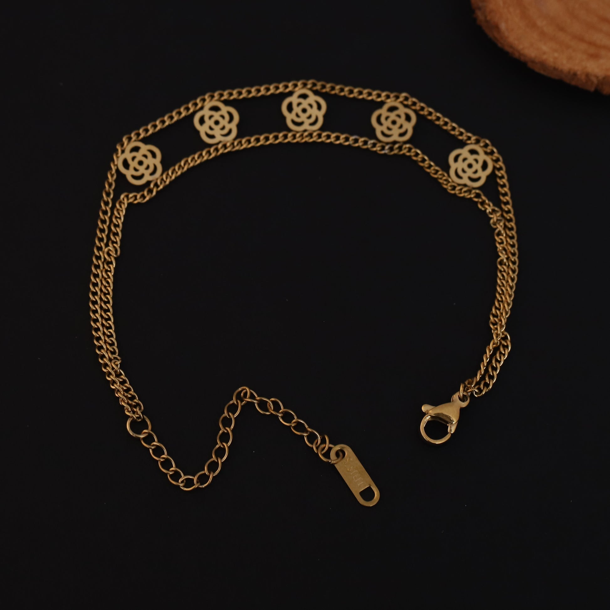 Gold Layered Floral Charm Bracelet - Stainless Steel Double Chain Jewelry