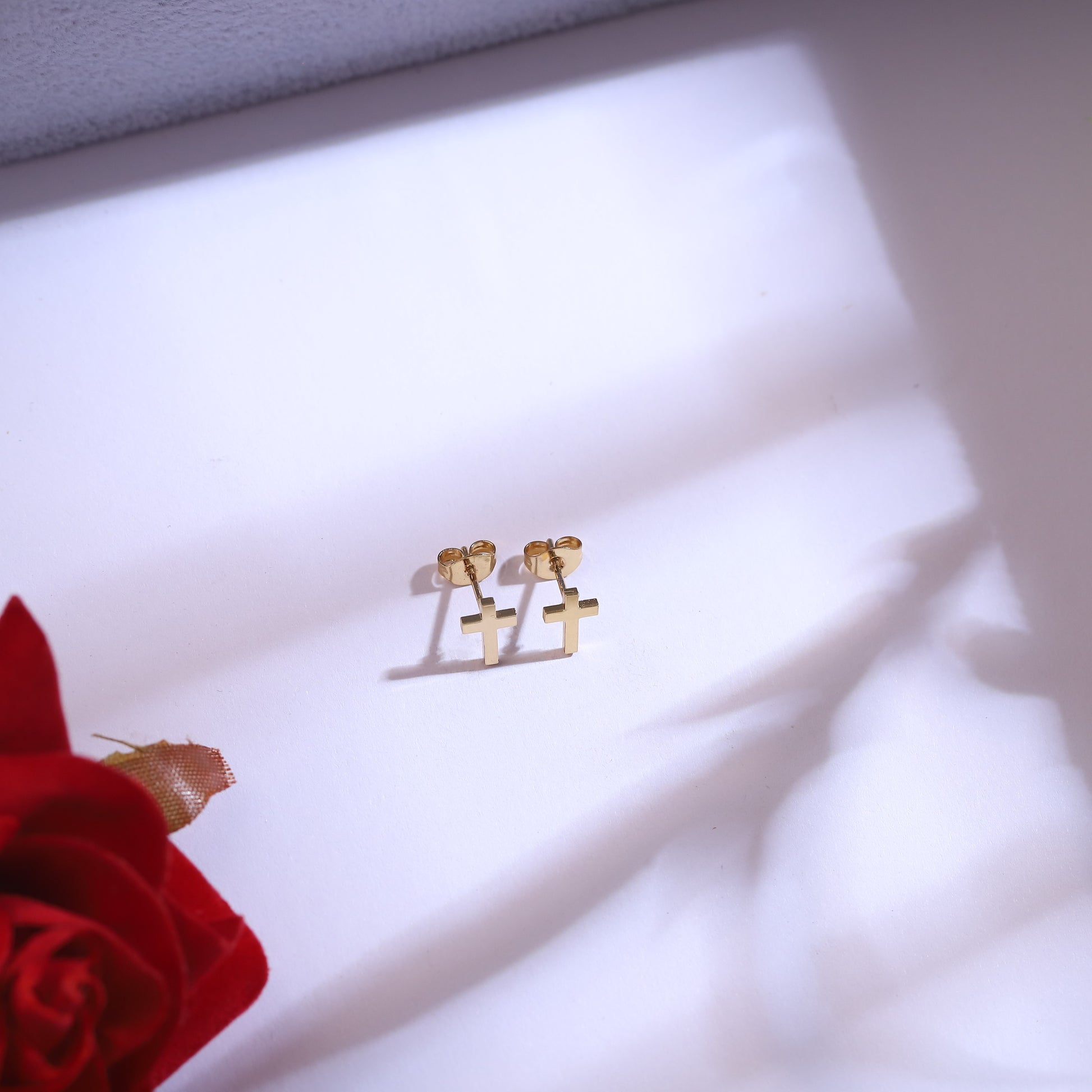 Coordinating Cross Stud Earrings: Two delicate, matching gold-tone cross stud earrings complete the ensemble, adding a harmonious touch to your look.