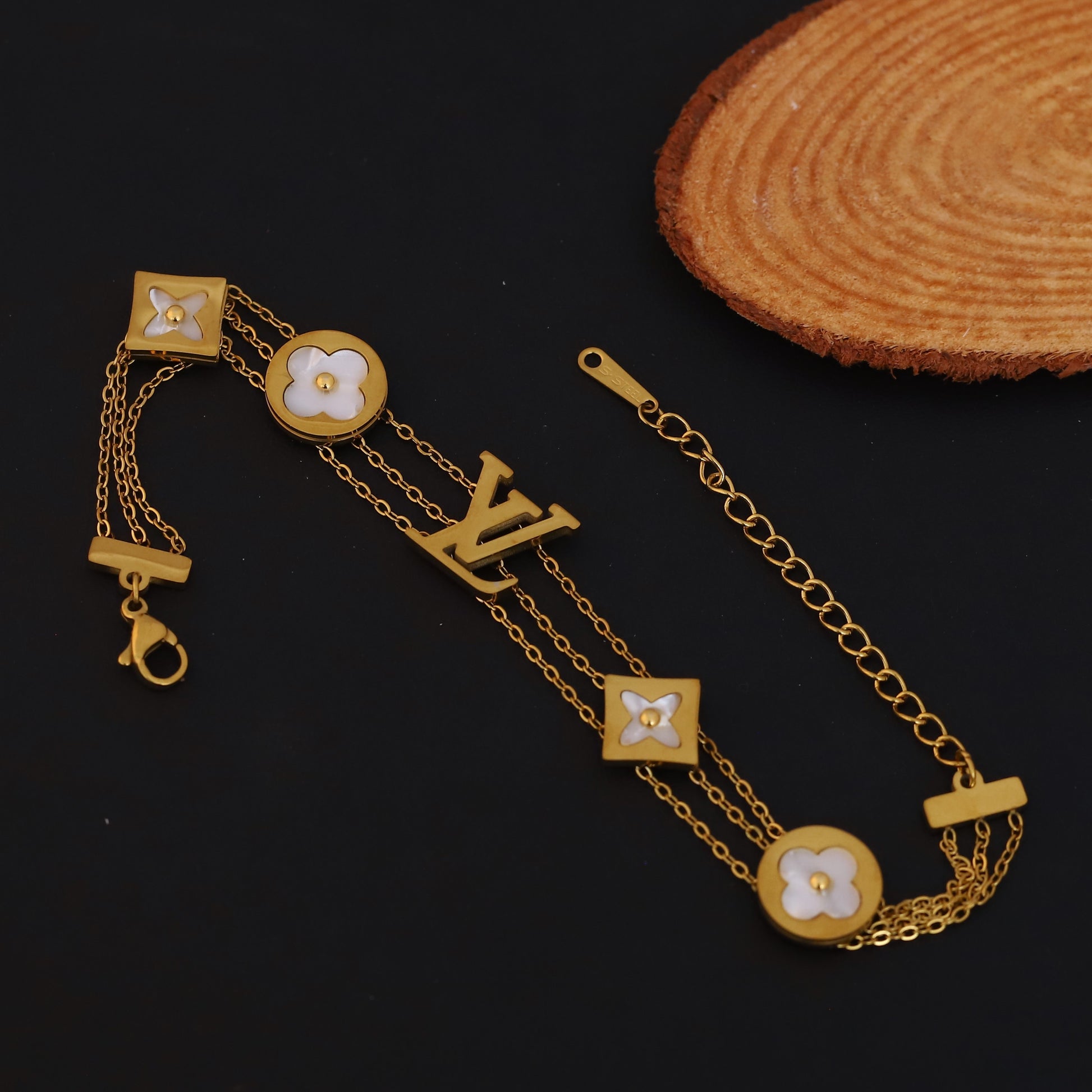 Layered Gold Bracelet with Mother of Pearl Clovers & LV Inspired Monogram | Statement Jewelry
