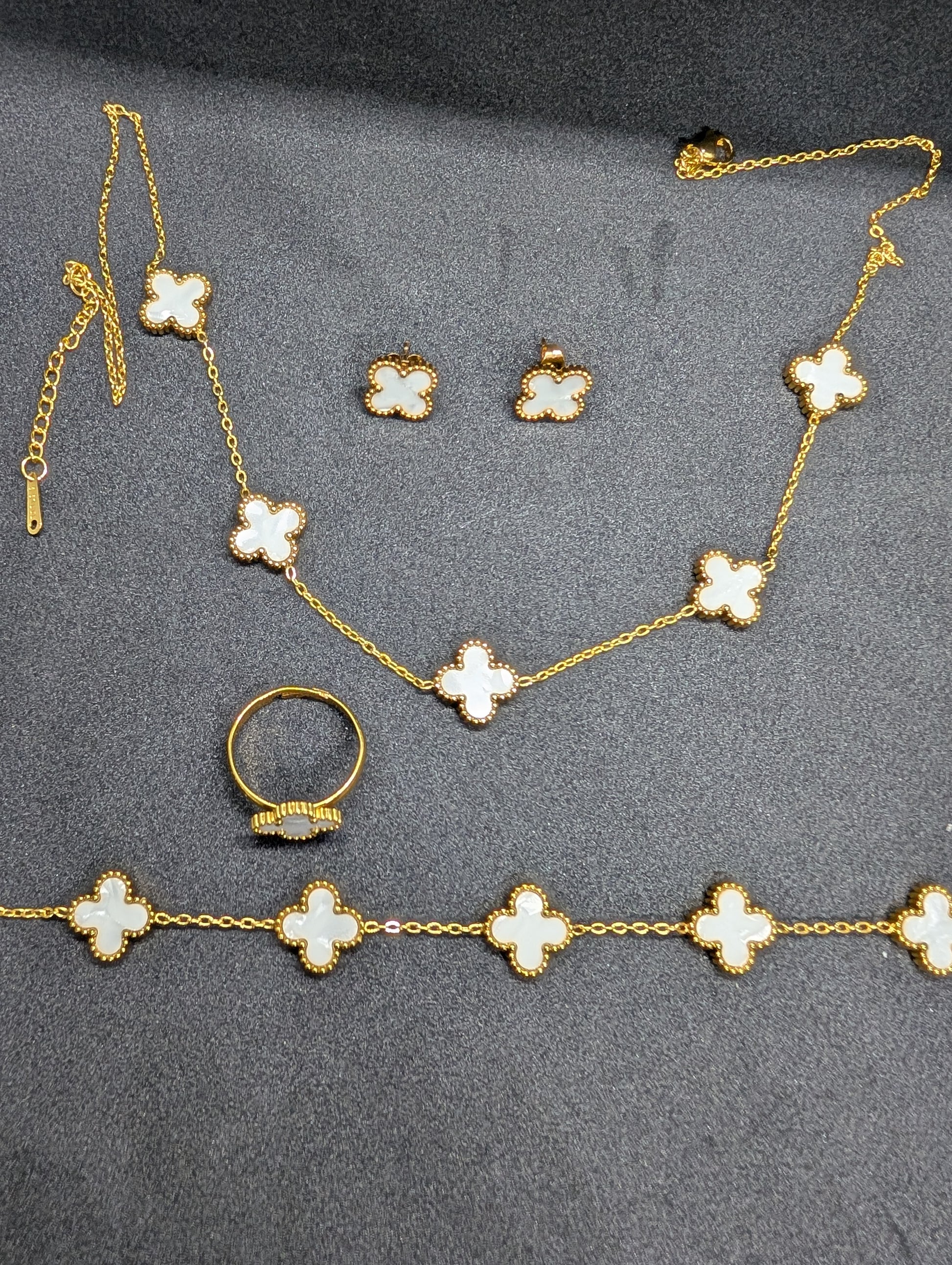 Luxury Clover Jewelry Set for Women | Includes Necklace, Bracelet, Stud Earrings & Adjustable Ring | Gold & White