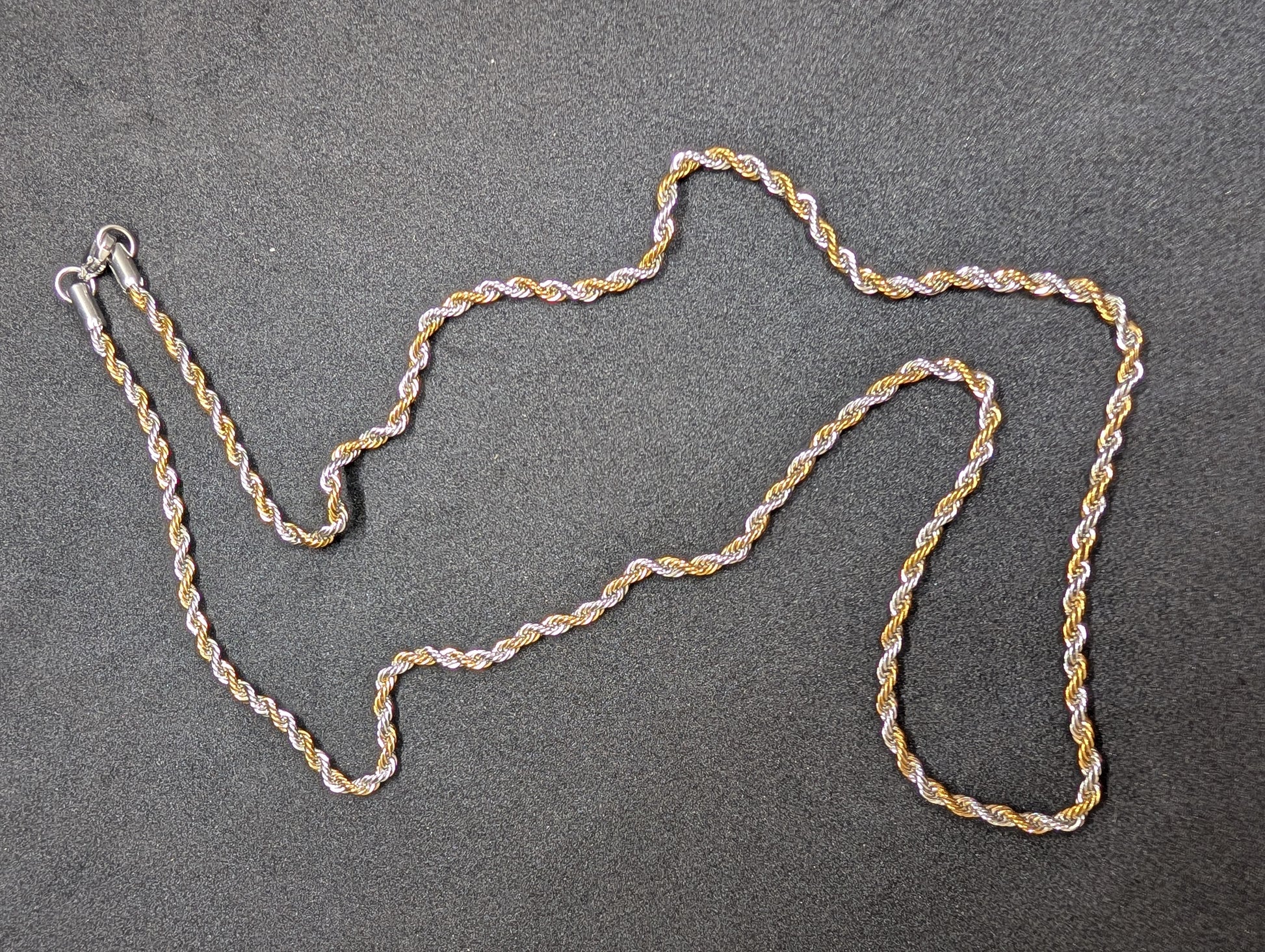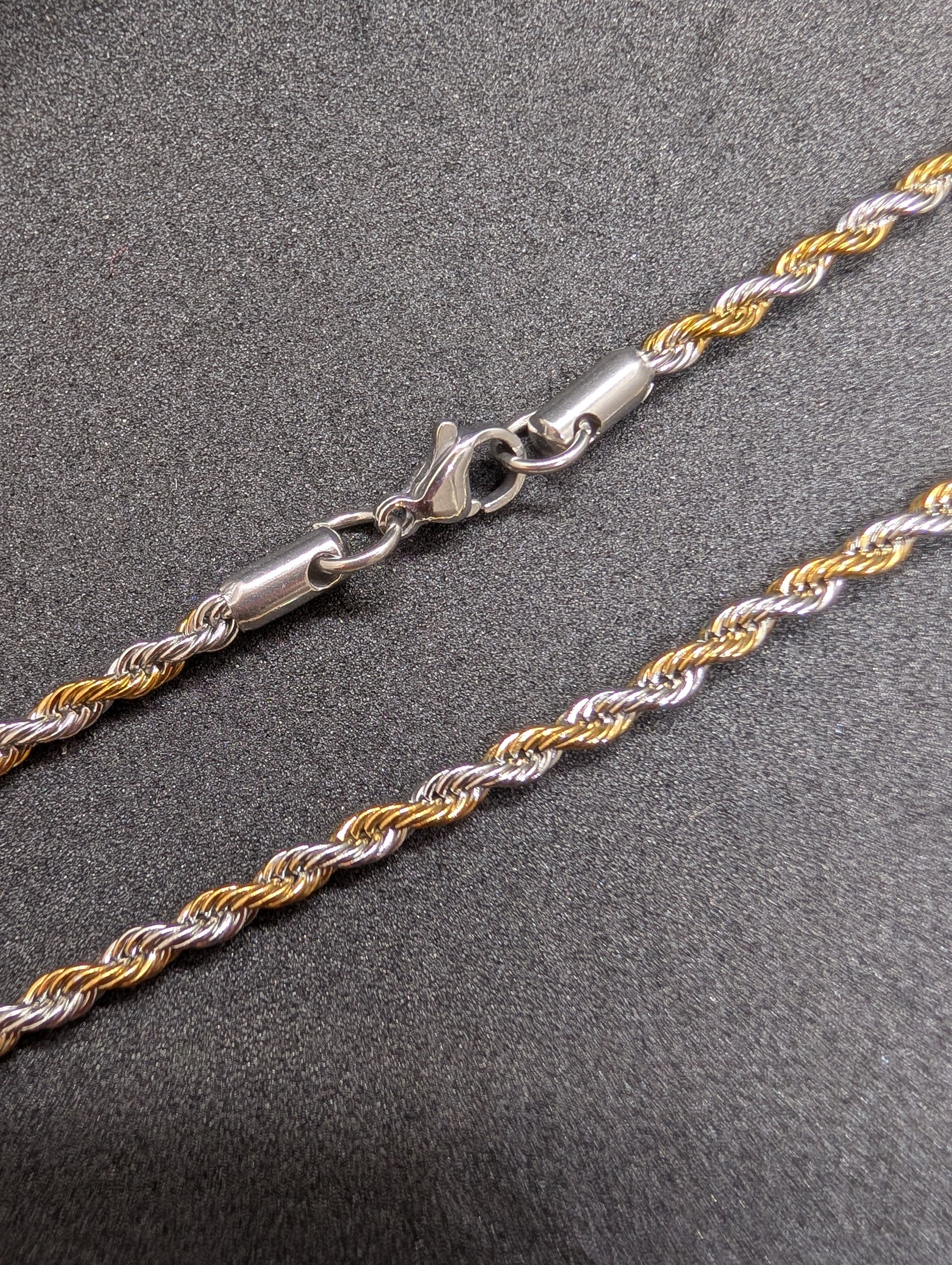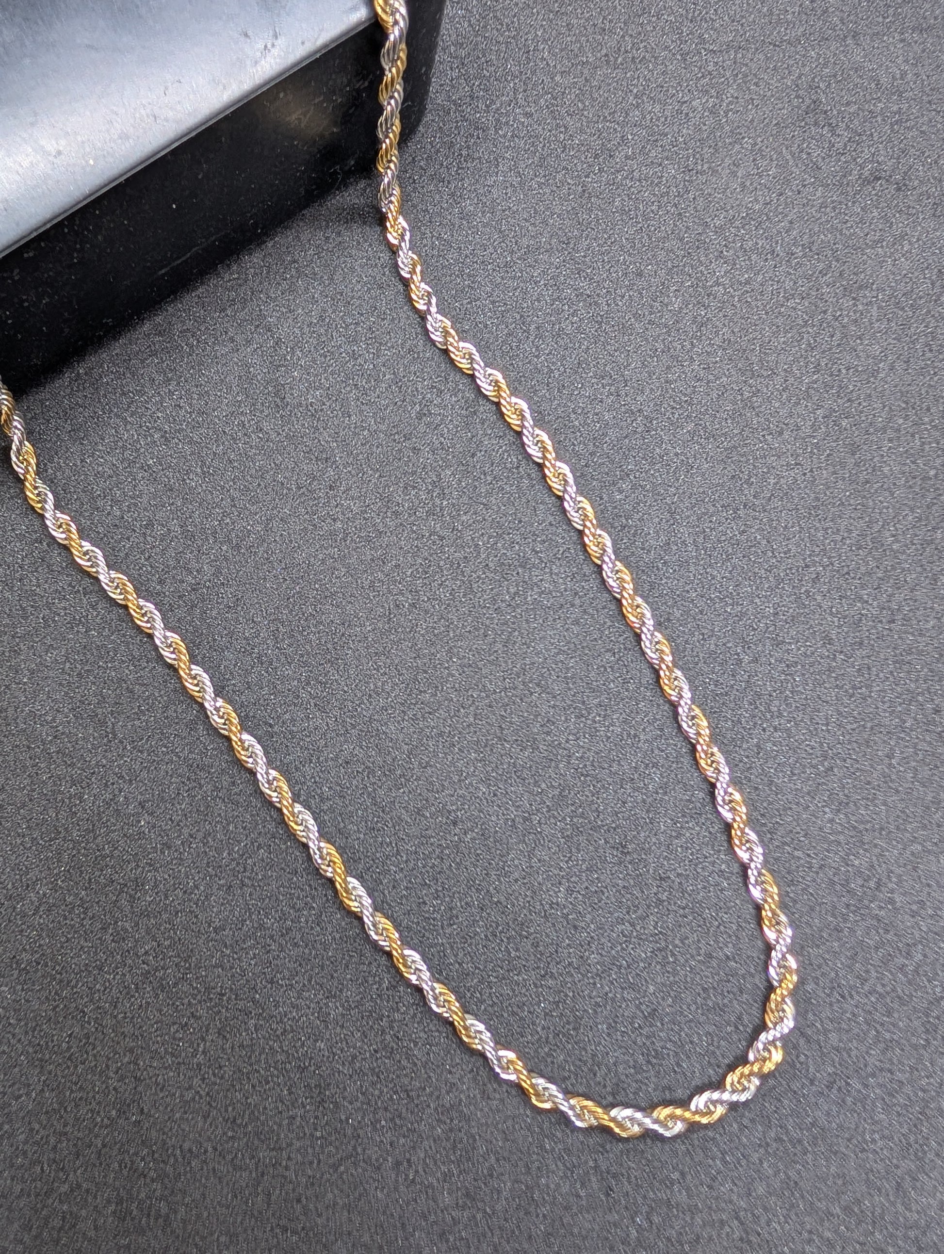 Elevate your style with our durable Men's Two-Tone Rope Chain. Features a twisted design in contrasting gold and silver finishes. Perfect for daily wear or layering.