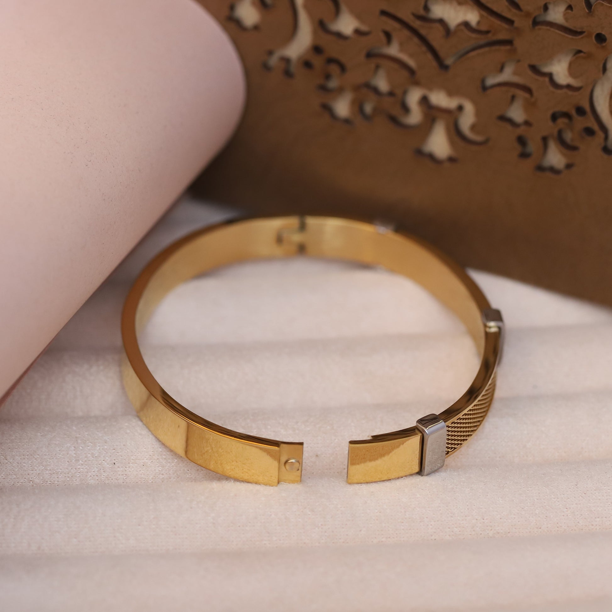 Elevate your wristwear with this mesh inlay gold bangle, a modern and textured piece that adds a touch of sophistication to your everyday style.