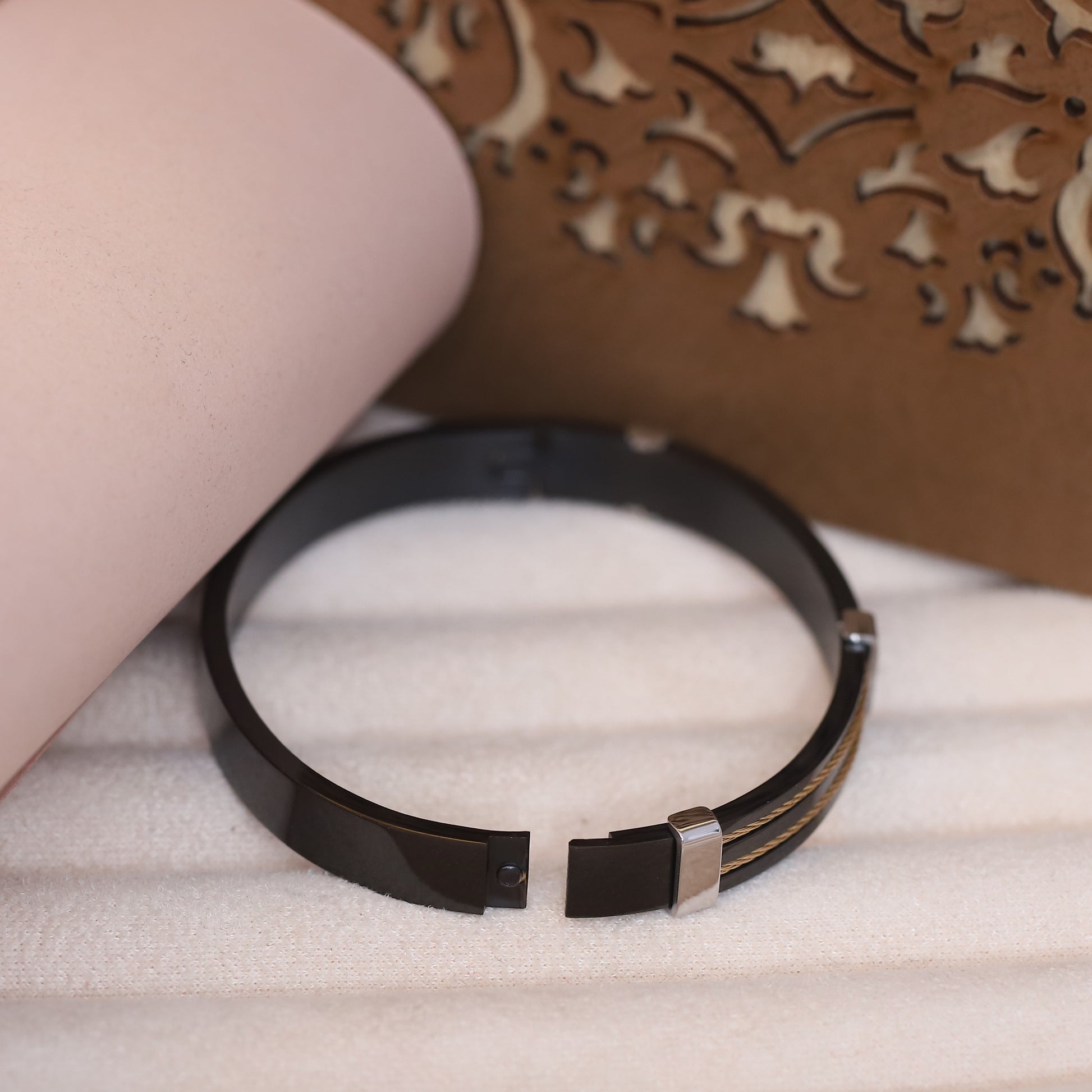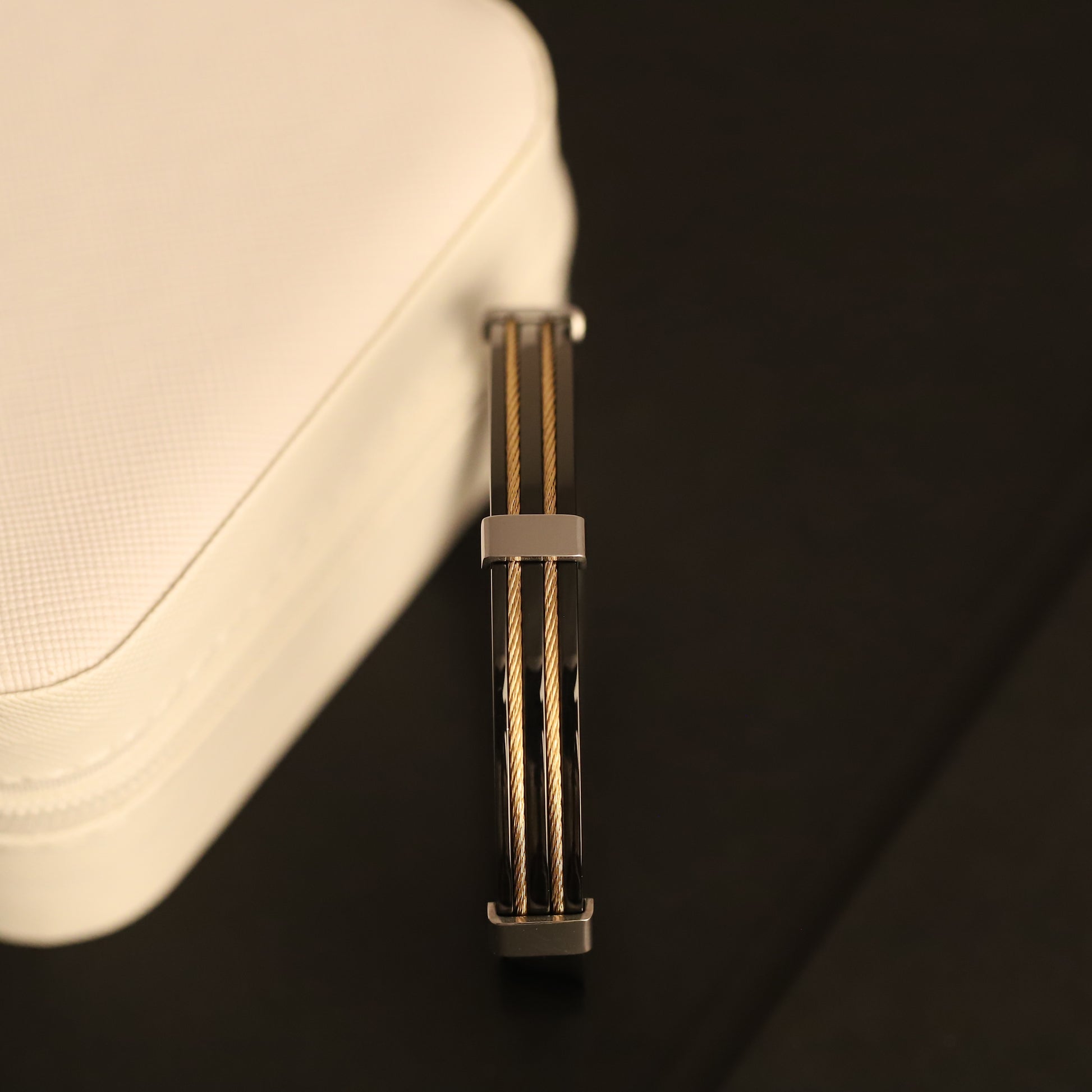 Elevate your style with this sophisticated and modern bracelet. Featuring a sleek, black band and three delicate strands of gleaming gold-tone wire, this piece offers a striking contrast of textures and colors. A polished silver-tone clasp adds a touch of understated elegance, completing a design that is both contemporary and timeless. Perfect for adding a refined edge to any outfit, this bracelet is a versatile accessory for both casual and formal occasions.