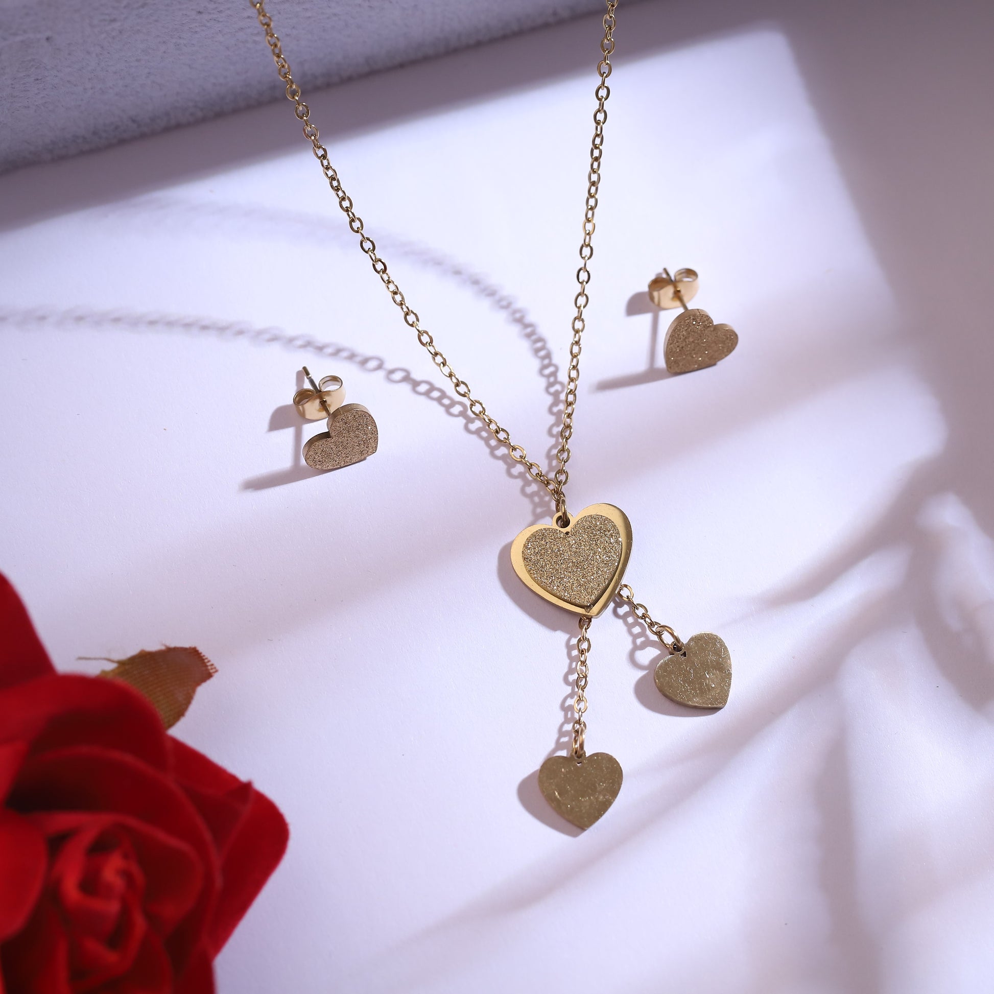 This charming necklace and earring set offers a delightful blend of heartfelt design and modern layering. The necklace features a graceful Y-lariat style, with a central textured heart pendant that beautifully descends into two smaller, smooth heart charms, creating a captivating dangle effect. The set is perfectly complemented by matching dainty stud earrings, each featuring the same elegant textured heart design. This versatile set is ideal for adding a touch of romance and contemporary flair to any outfit, making it perfect for daily wear or as a thoughtful gift for a loved one.