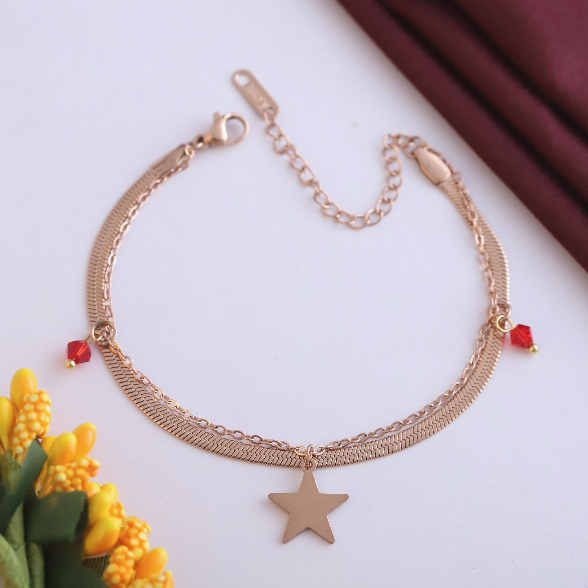 Rose Gold Double Layer Bracelet - Star Charm & Red Bead Dangles