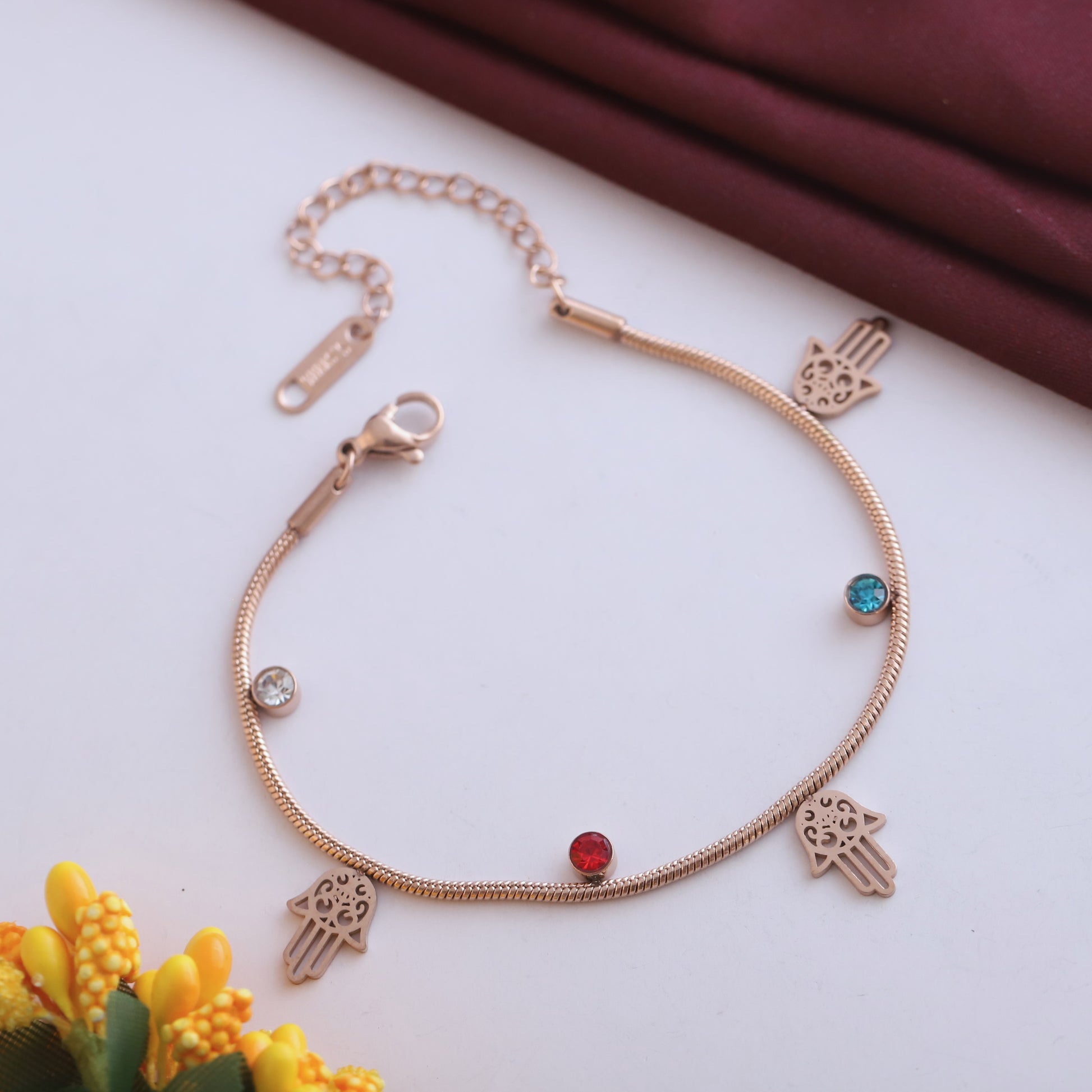 Rose Gold Hamsa Hand Charm Bracelet - Colorful Crystal Protection Jewelry