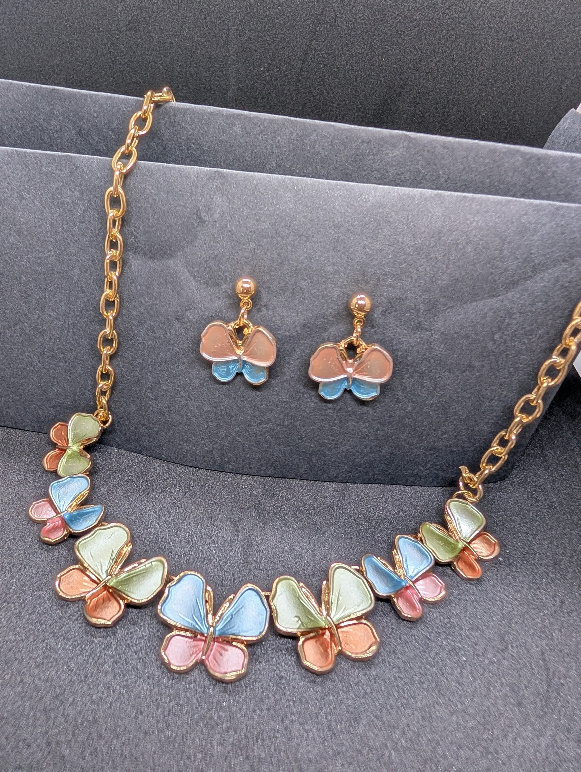 Whimsical Pastel Butterfly Enamel Jewelry Set – Gold-Toned Chunky Chain Necklace & Matching Drop Earrings