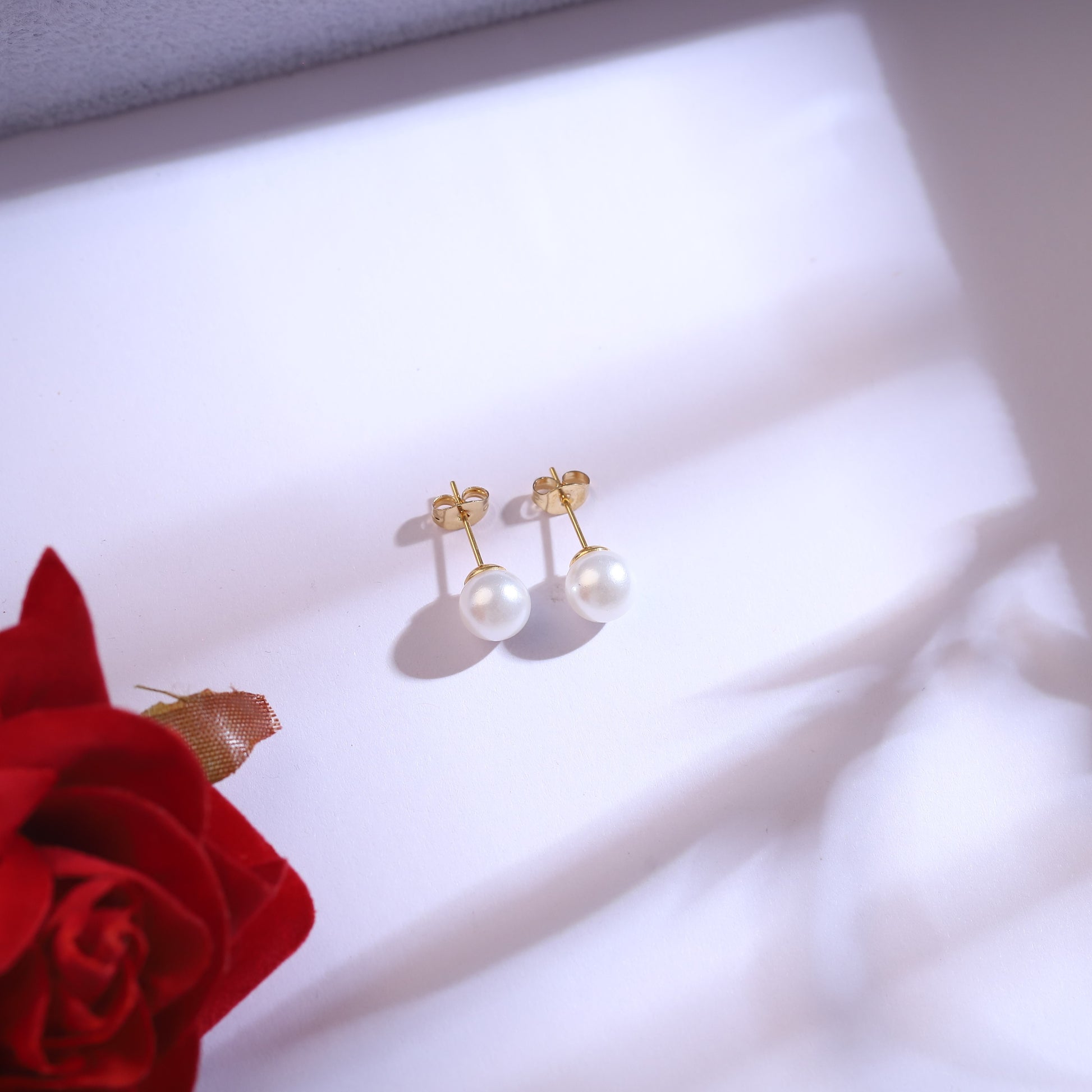 Earrings: Gold-toned stud earrings with white faux pearl drops.